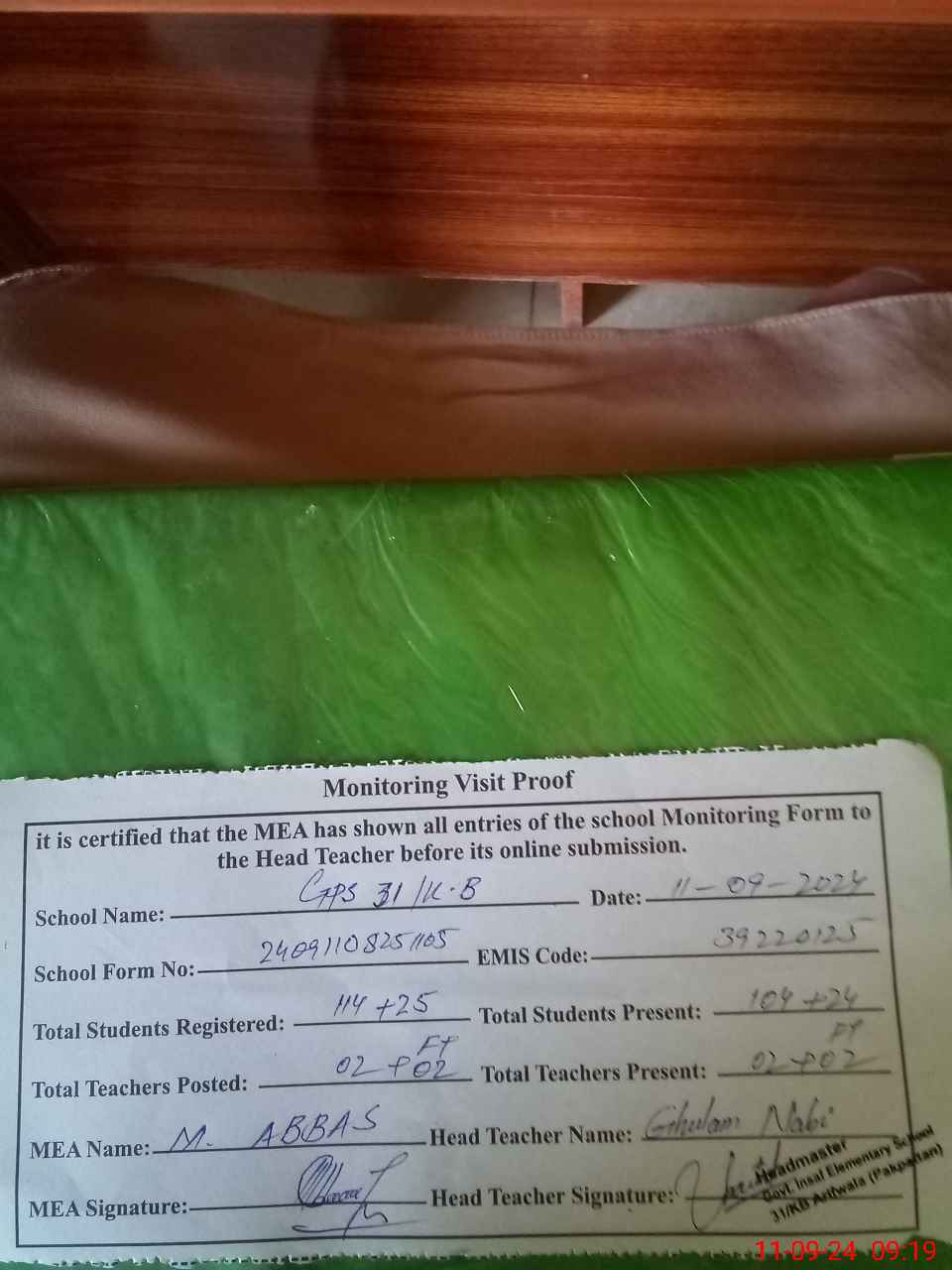 | Certified that this School was Inspected by the Undersigned MEA/DMO Today and the Information Stated Above is as Per Record. | |||||