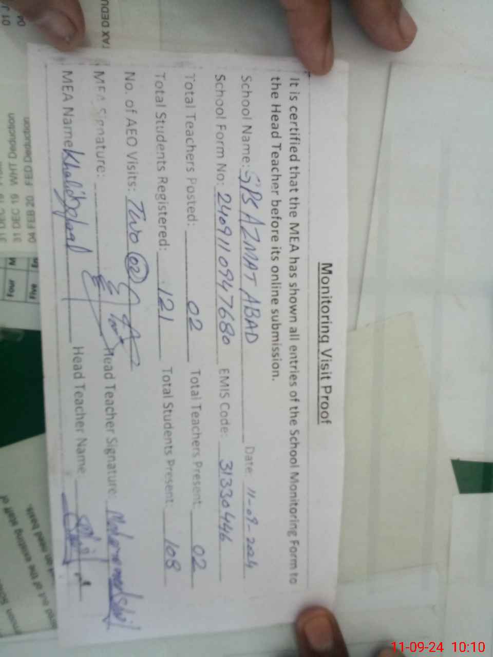 | Attendance Register | Head Teacher | MEA with School | Visit Proof |