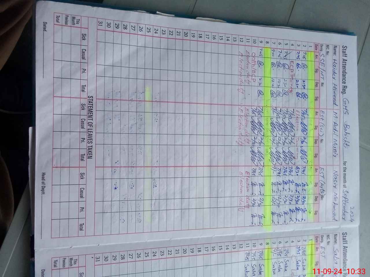 | Leave | Duty | Absent | Maternity | Medical | Ex- Pak |