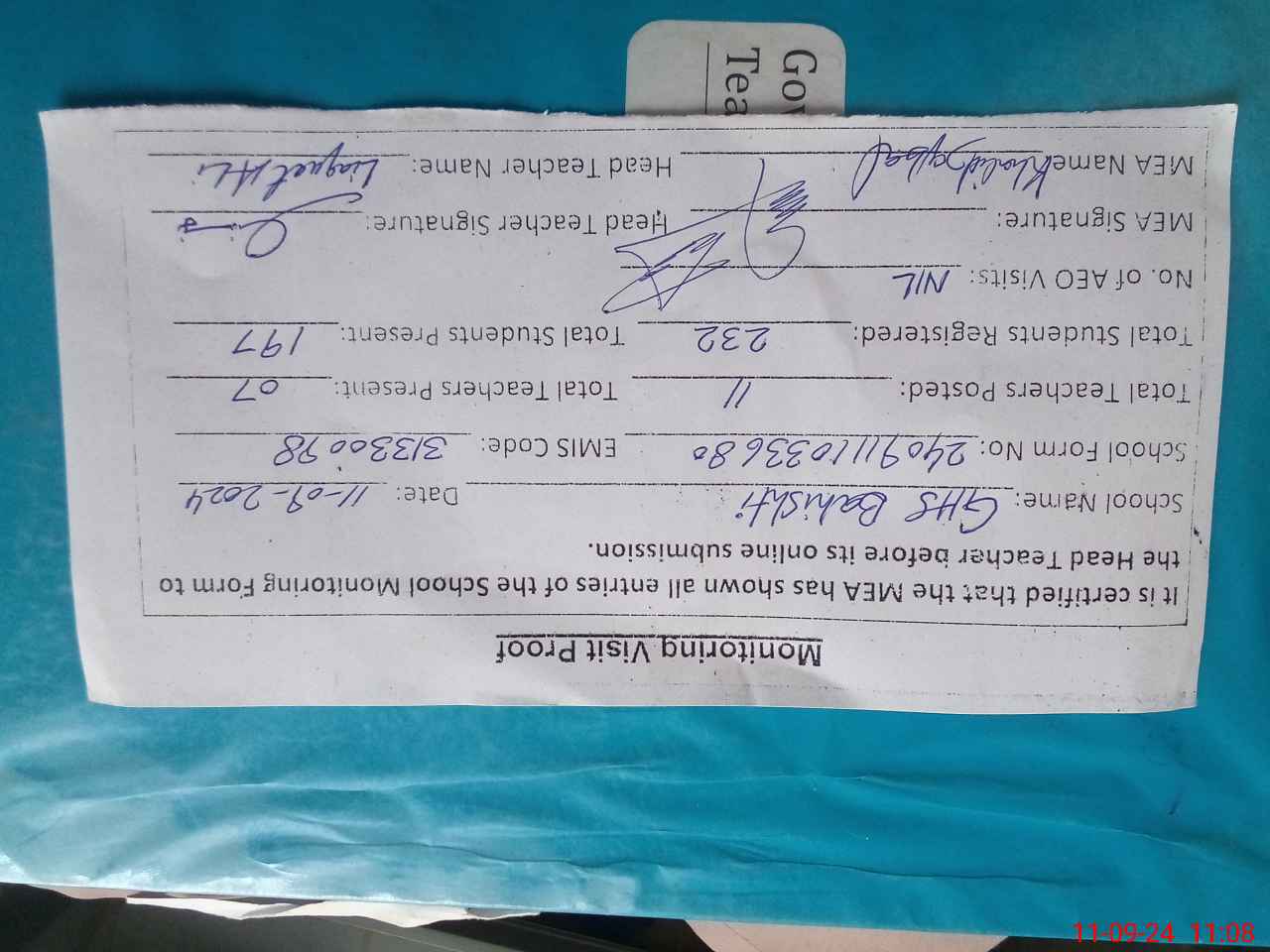 | Attendance Register | Head Teacher | MEA with School | Visit Proof |