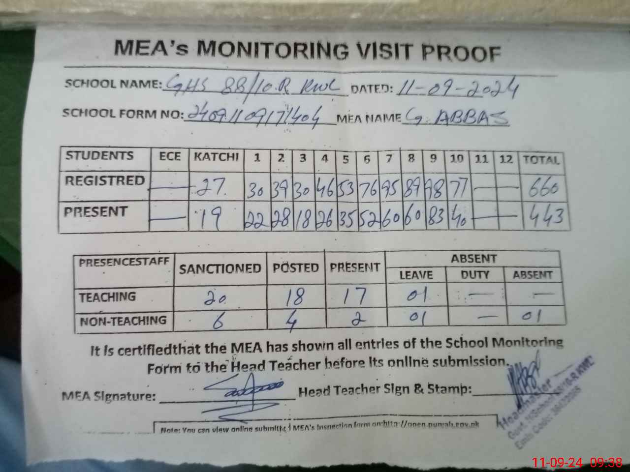 | Attendance Register | Head Teacher | MEA with School | Visit Proof |