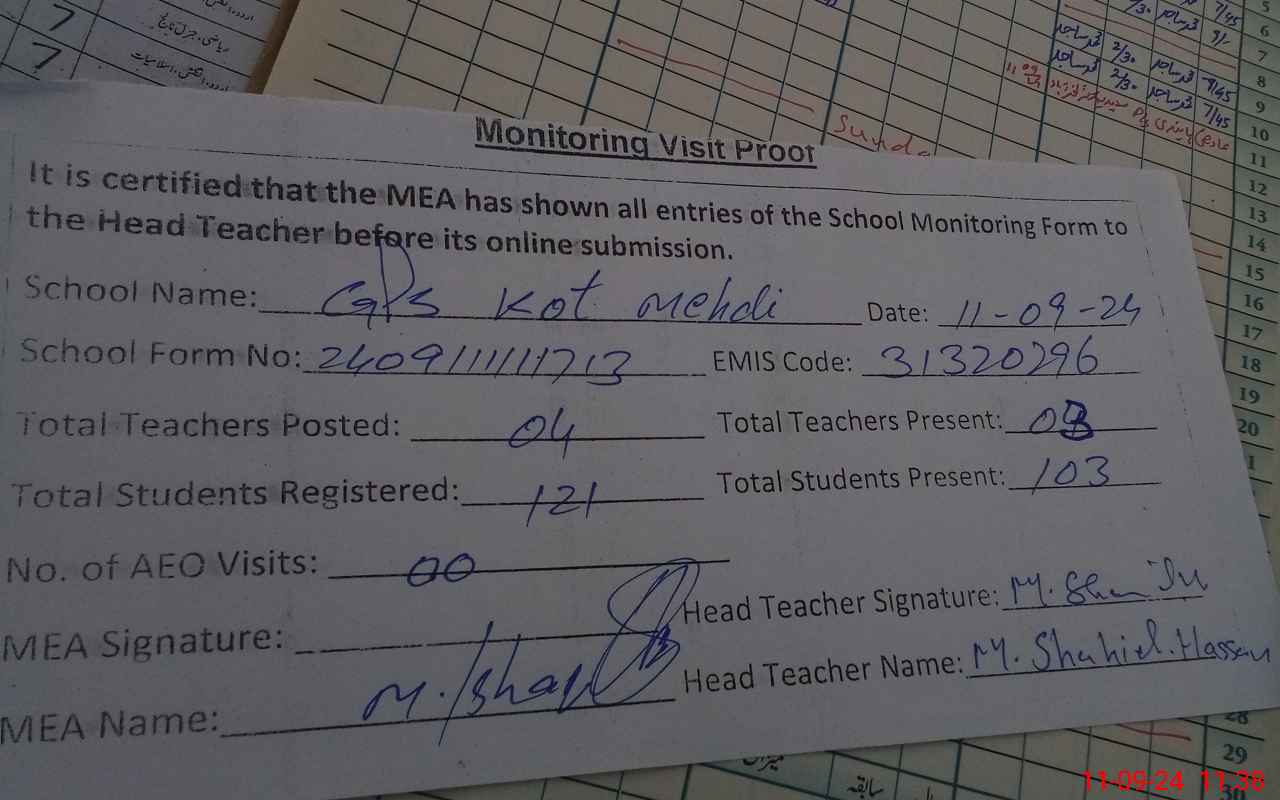 | Attendance Register | Head Teacher | MEA with School | Visit Proof |