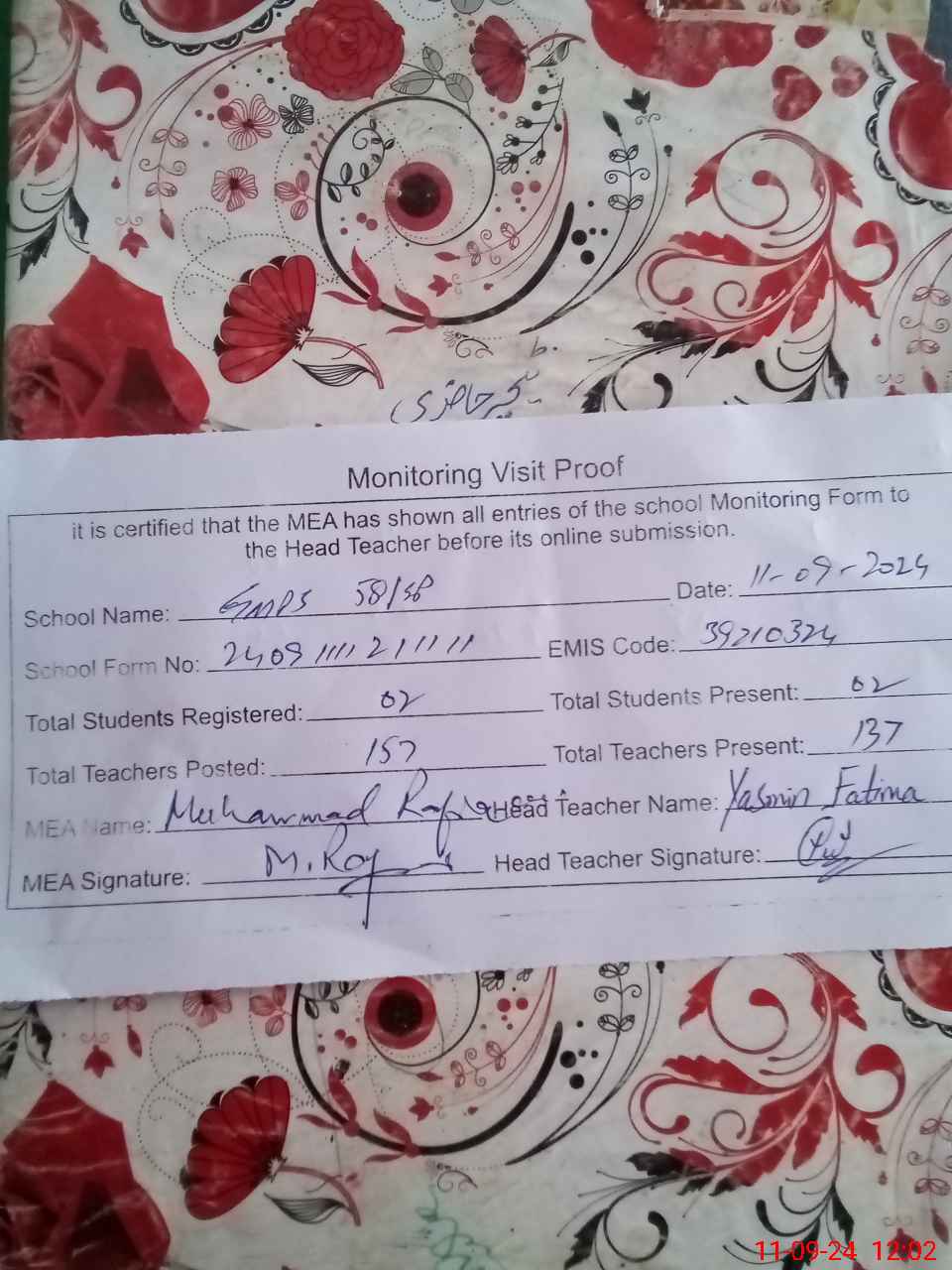 | Attendance Register | Head Teacher | MEA with School | Visit Proof |