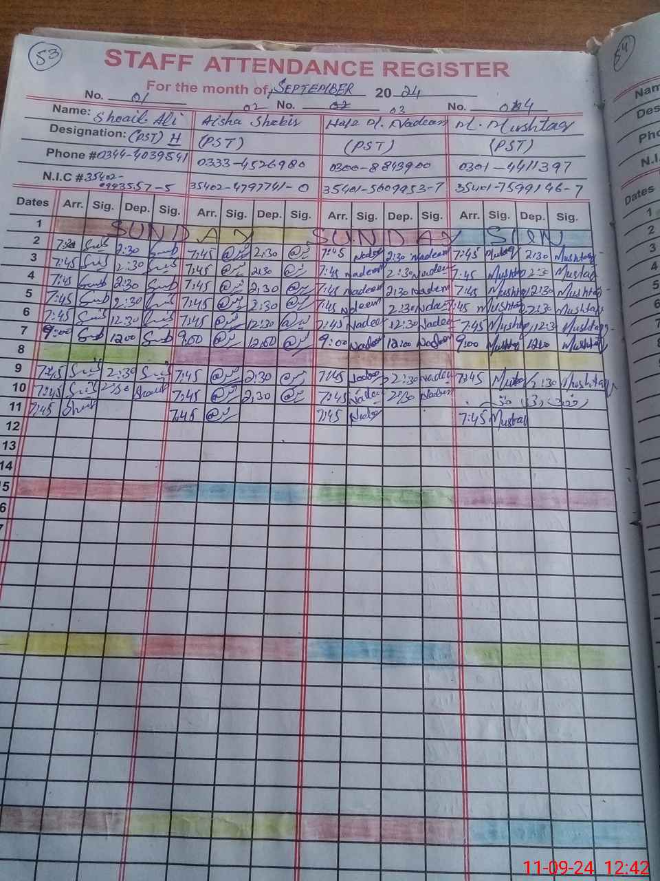 | CNIC | Full Name | Designation | R/C | Absence During Last Calender Month |