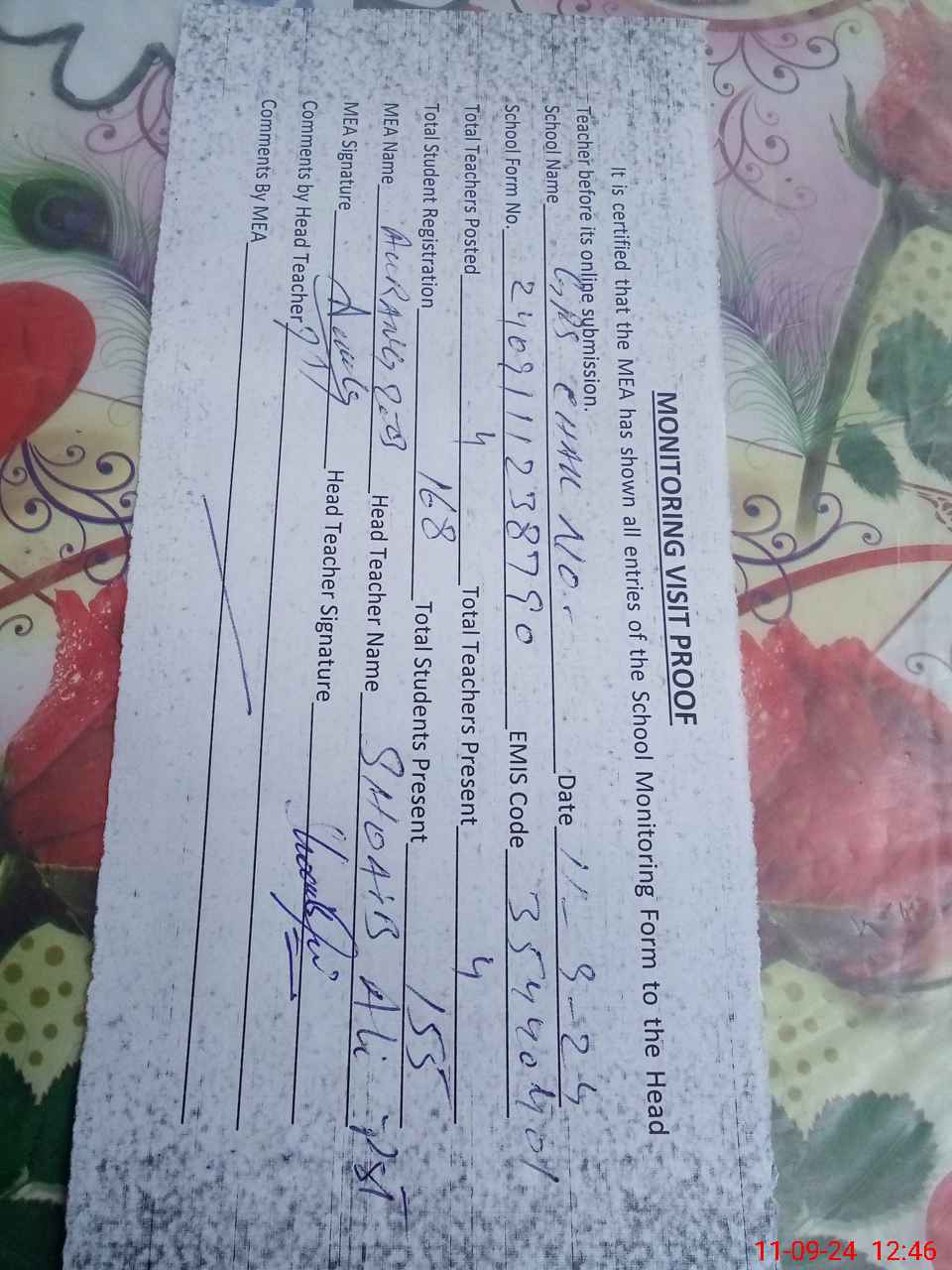| Attendance Register | Head Teacher | MEA with School | Visit Proof |