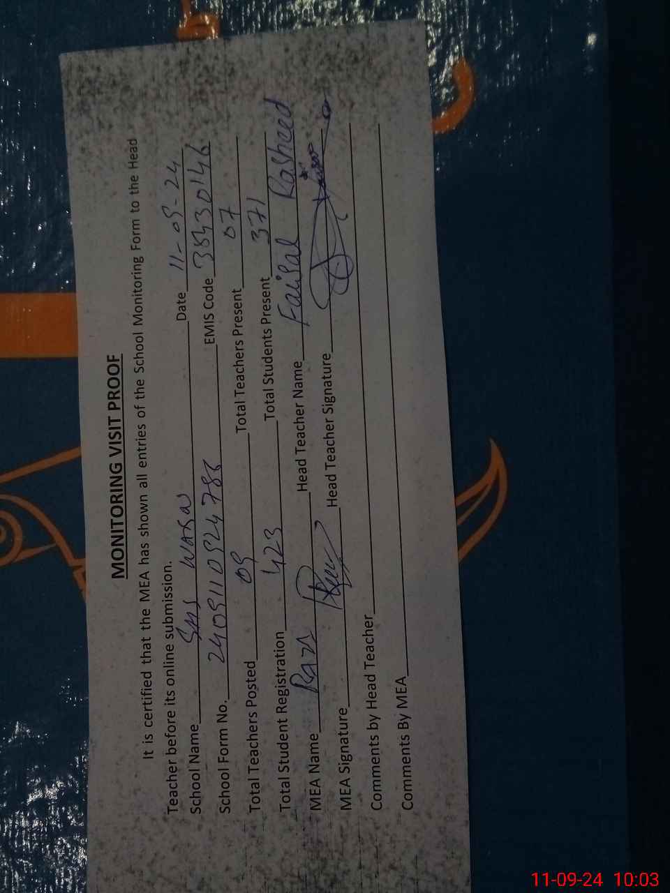 | Attendance Register | Head Teacher | MEA with School | Visit Proof |