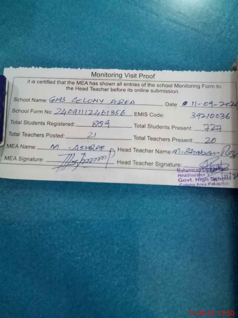| EMIS Code: 39210036 | Name of School: GHS COLONY AREA PAKPATTAN | |||