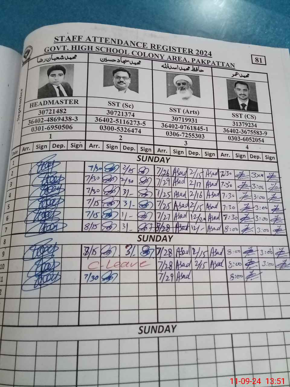 | Name: SA**** HU**** Designation: (School Headmaster's/Headmistress's) HEADMASTER Phone/Cell Number: 03**** |