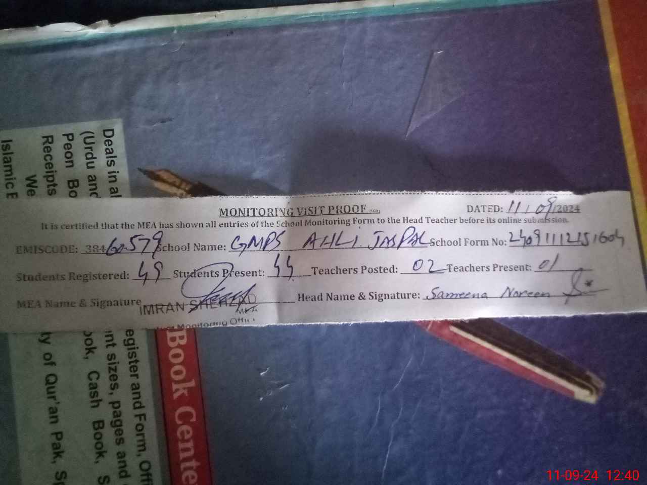 | Monitoring Date: 11-09-2024 | Start Time: 11-09-2024 12:15 PM | End Time: 11-09-2024 12:40 PM | Name of MEA: IM**** SH**** | |
