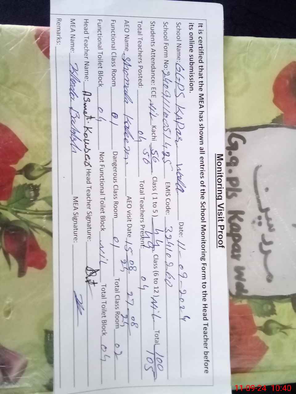 | Attendance Register | Head Teacher | MEA with School | Visit Proof |