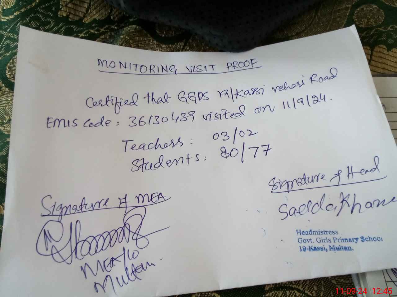| Certified that this School was Inspected by the Undersigned MEA/DMO Today and the Information Stated Above is as Per Record. | |||||