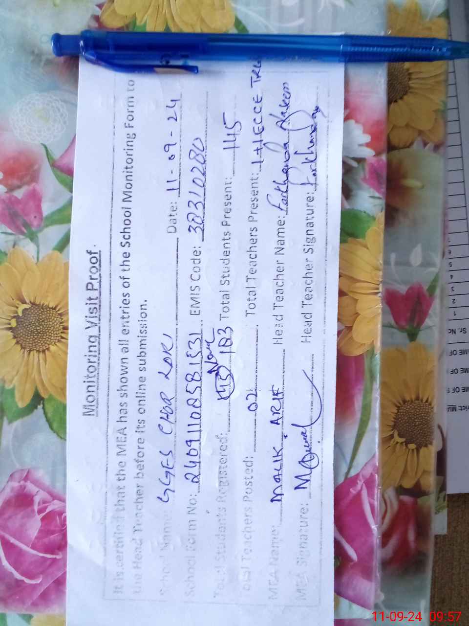 | Attendance Register | Head Teacher | MEA with School | Visit Proof |