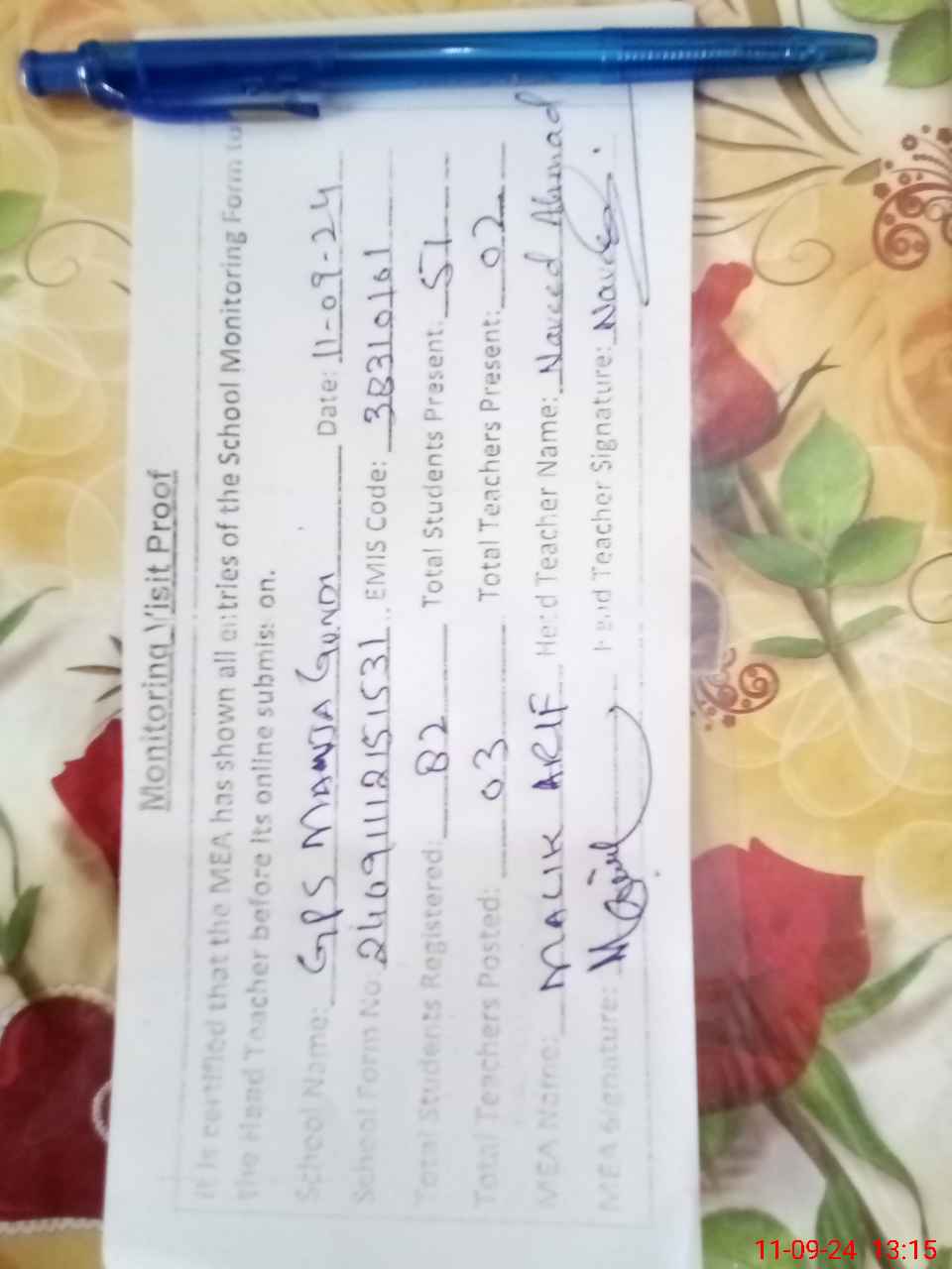 | Attendance Register | Head Teacher | MEA with School | Visit Proof |