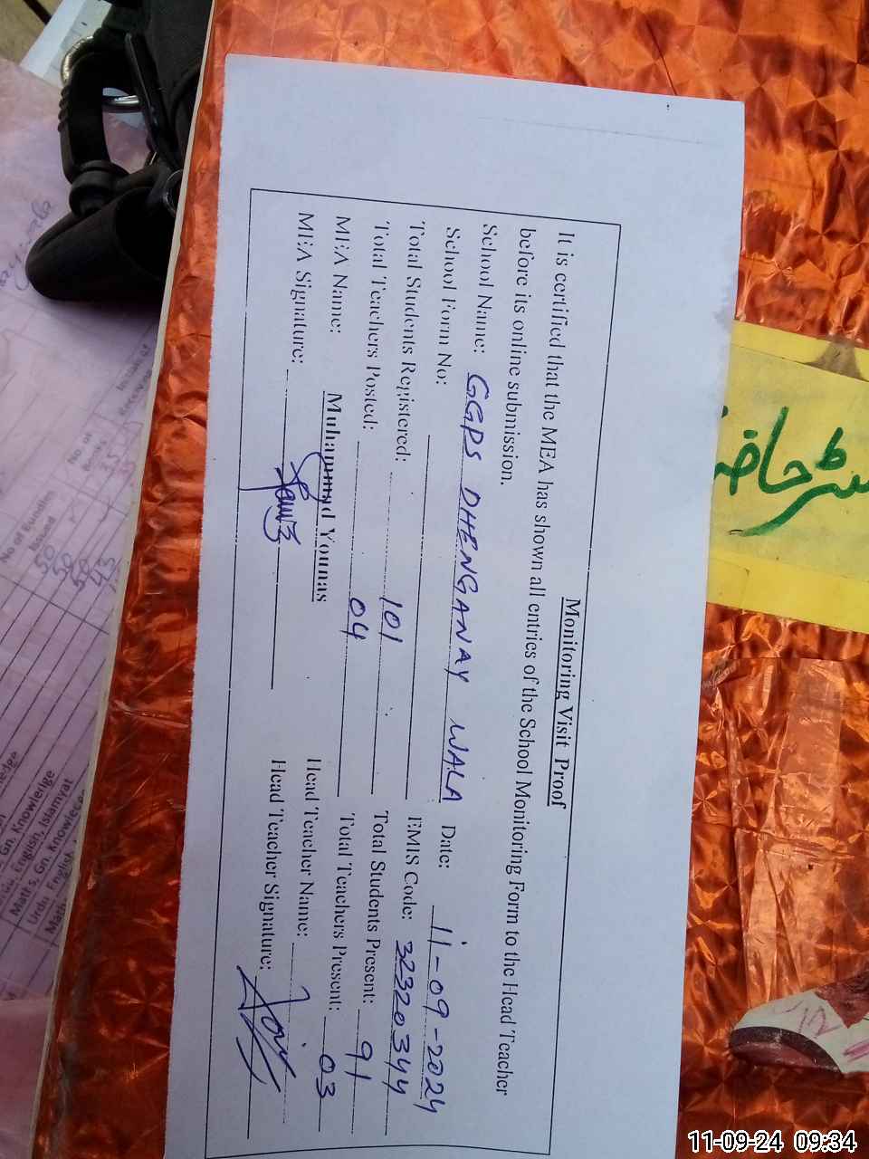 | Attendance Register | Head Teacher | MEA with School | Visit Proof |