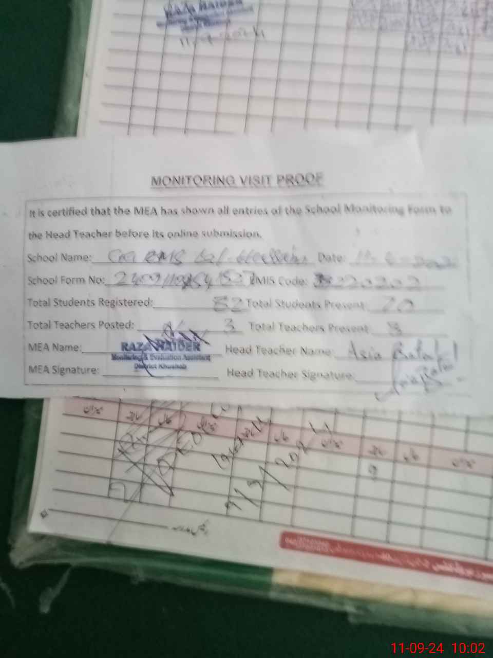 | Attendance Register | Head Teacher | MEA with School | Visit Proof |