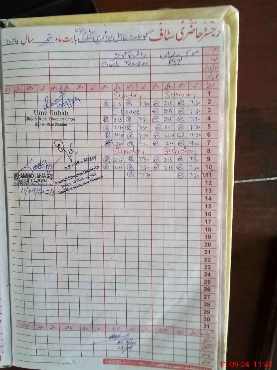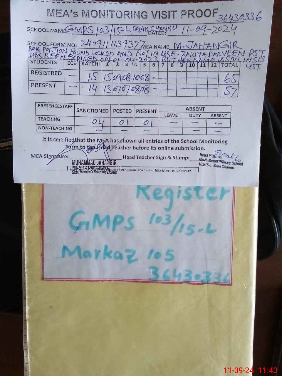 | Remarks (Use Separate Page if Required): BOYS PORTION FOUND LOCKED AND NOT IN USE ZAKIYA PARVEEN PST HAS BEEN EXPIRED ON 01 APRIL 2023 BUT HER NAME IS STILL EXIST IN SIS LIST OF PMIU NSB GRANTS AND FTF RECORDS ARE NOT MAINTAINED BANK STATEMENTS UPTO 14 MAY 2024 ARE AVAILABLE AFTER THIS NO STATEMENTS ARE AVAILABLE WASH CLUB RECORDS ARE NOT AVAILABLE RANDOM CLASS KATCHI IS NOW IN CLASS TWO AND THREE LESSON PLANS ARE NOT AVAILABLE GMPS 103 15L MIAN CHANNU | |||||
