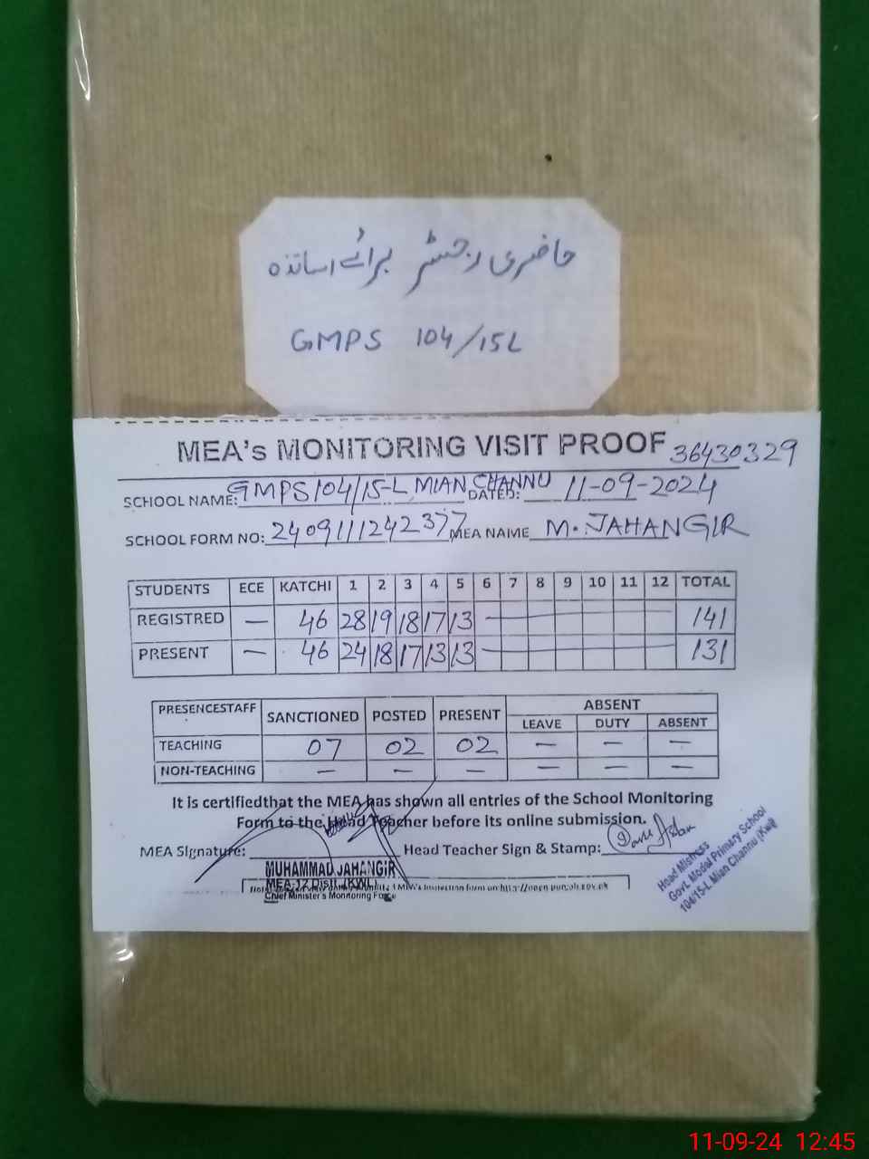 | Attendance Register | Head Teacher | MEA with School | Visit Proof |