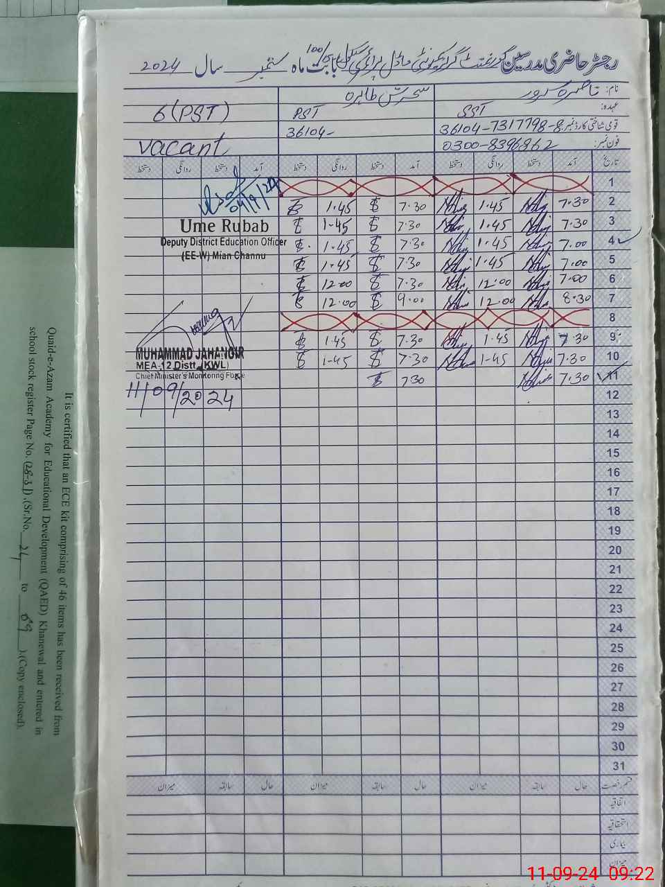| Name: NA**** SA**** Designation: (School Headmaster's/Headmistress's) S.S.T.(GENERAL Phone/Cell Number: 03**** |