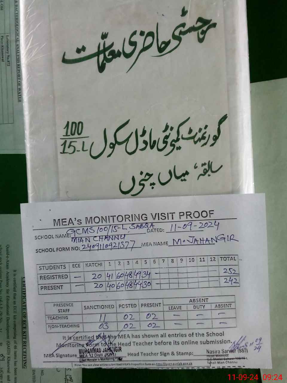 | Attendance Register | Head Teacher | MEA with School | Visit Proof |