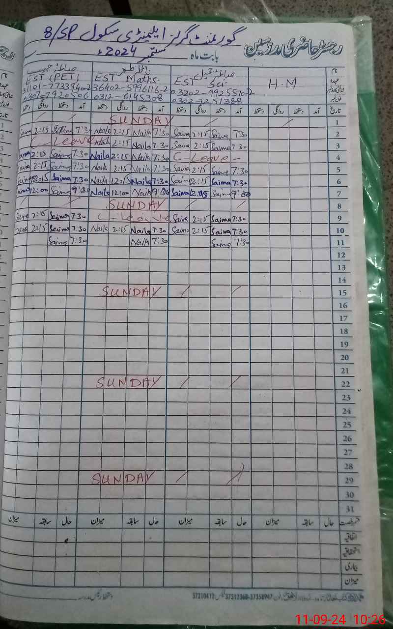 | Name: Gh**** Fa**** Designation: (School Headmaster's/Headmistress's) SST Science Phone/Cell Number: 03**** |
