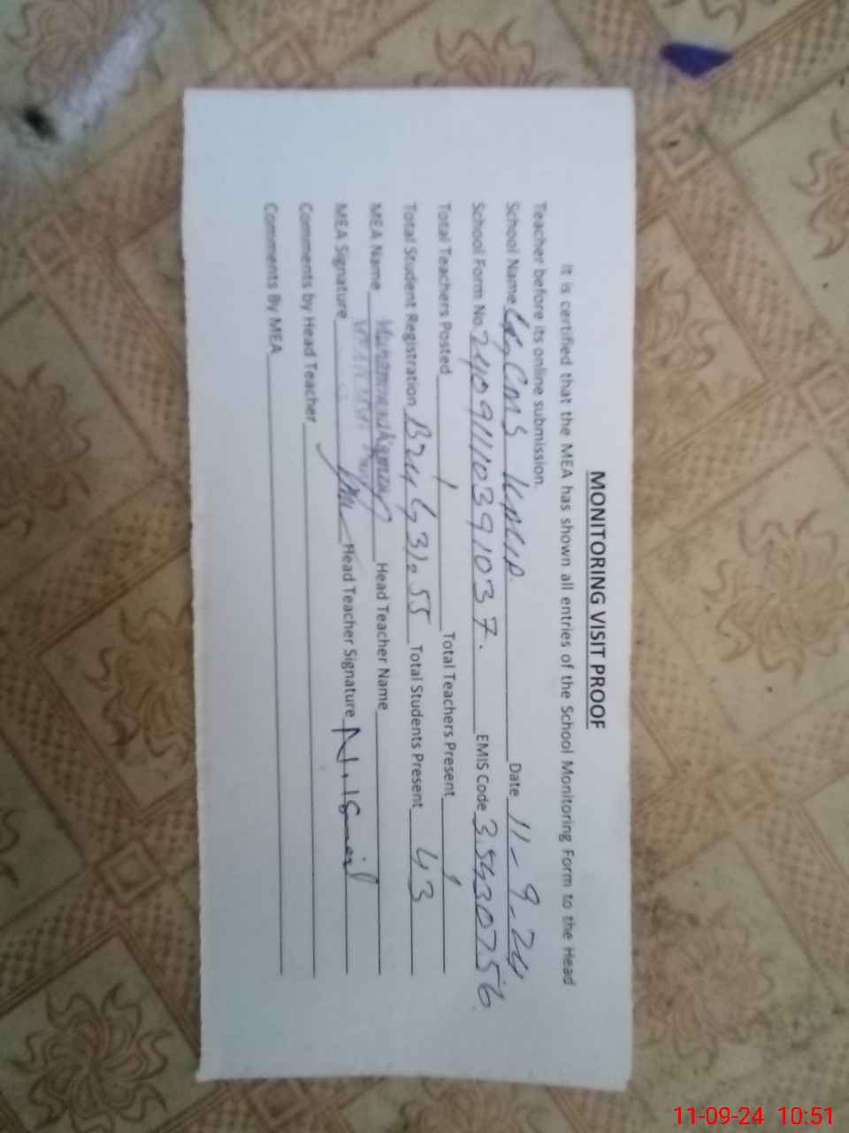 | Attendance Register | Head Teacher | MEA with School | Visit Proof |