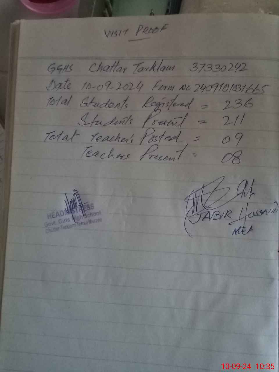 | Attendance Register | Head Teacher | MEA with School | Visit Proof |