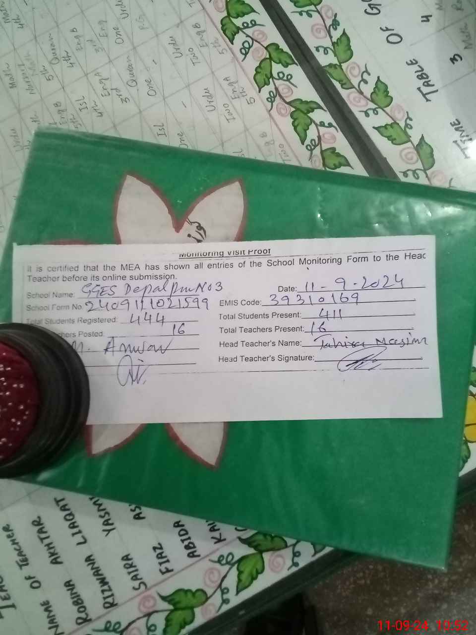 | Attendance Register | Head Teacher | MEA with School | Visit Proof |