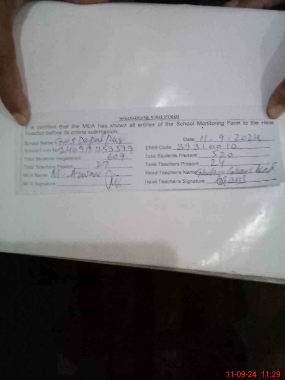 | Attendance Register | Head Teacher | MEA with School | Visit Proof |