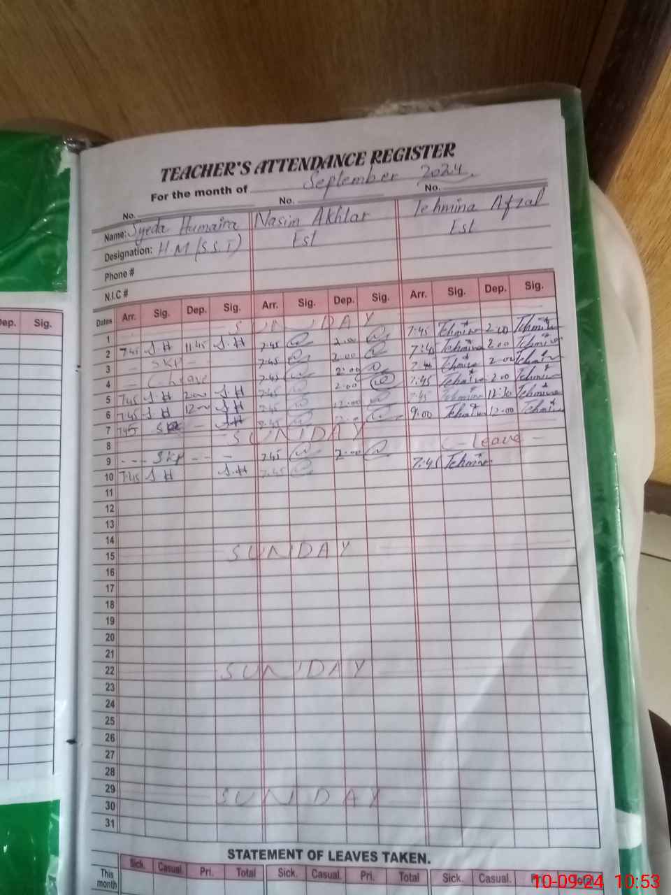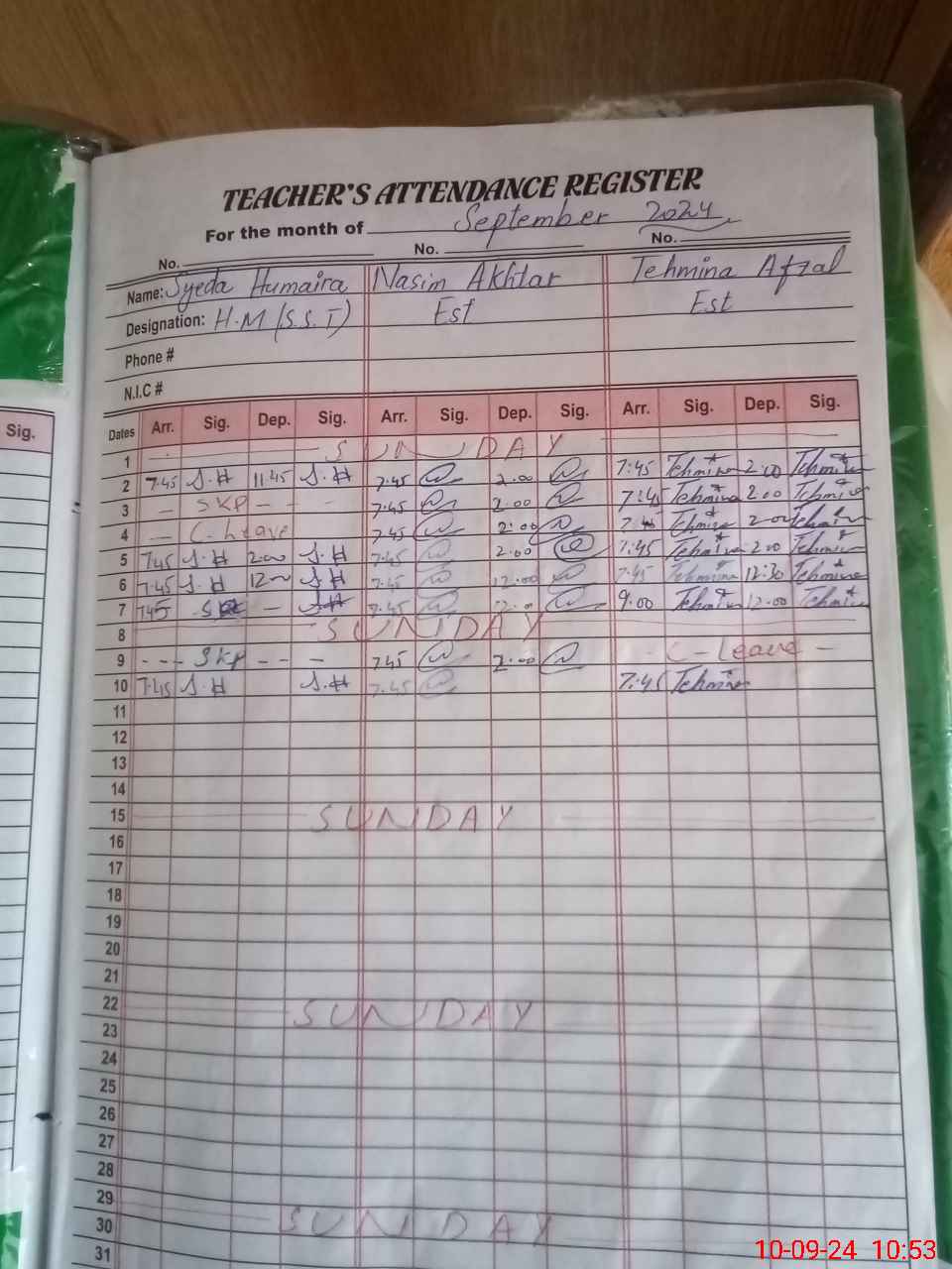 | CNIC | Full Name | Designation | R/C | Absence During Last Calender Month |