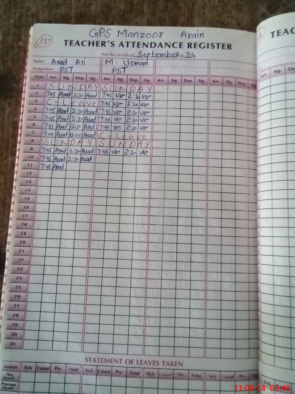 | Remarks (Use Separate Page if Required): Teacher Muhammad Usman not arivel in school from 10 sept 2024 register calam is blank Mark absent | |||||