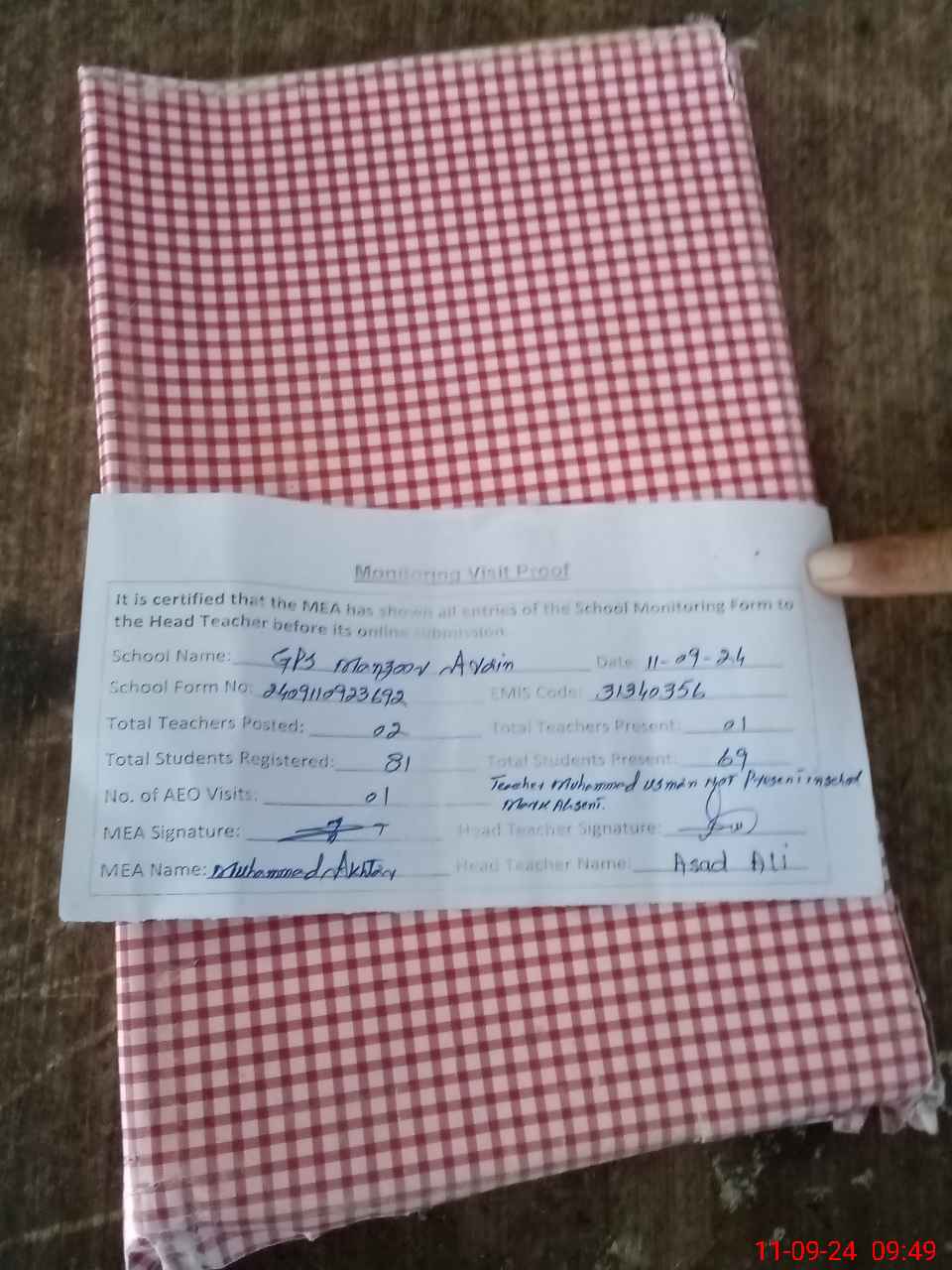 | Attendance Register | Head Teacher | MEA with School | Visit Proof |