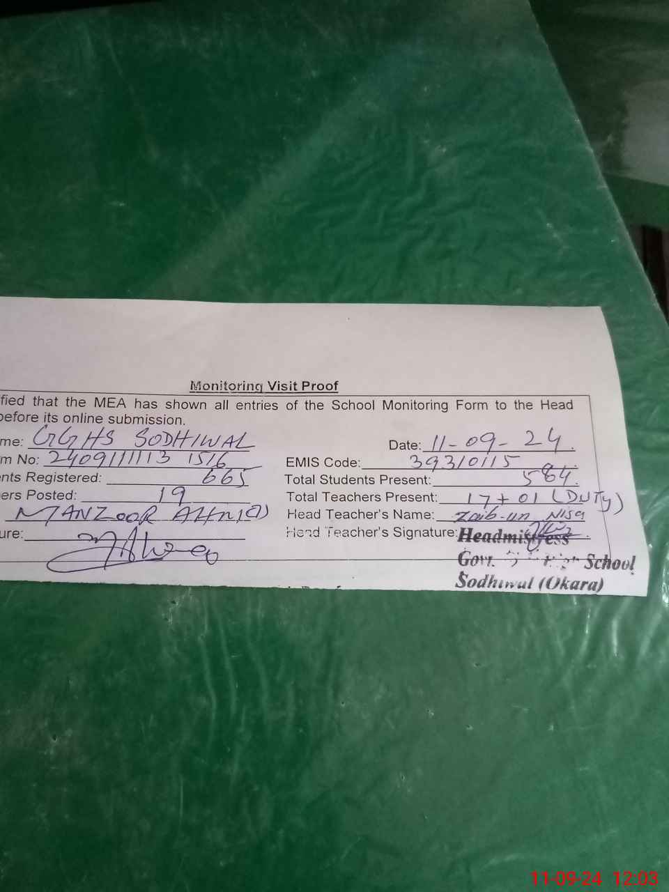 | Attendance Register | Head Teacher | MEA with School | Visit Proof |