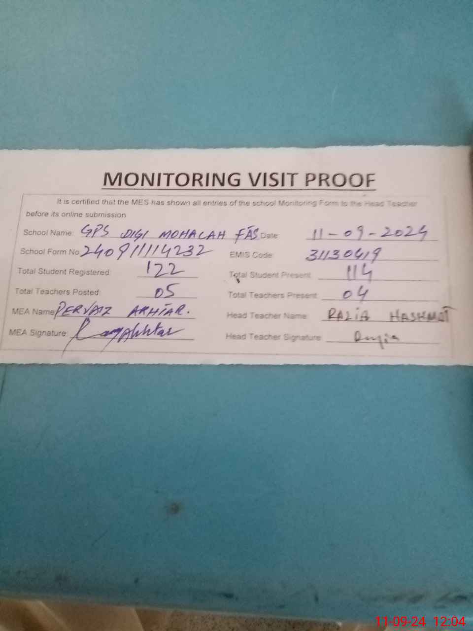| Attendance Register | Head Teacher | MEA with School | Visit Proof |