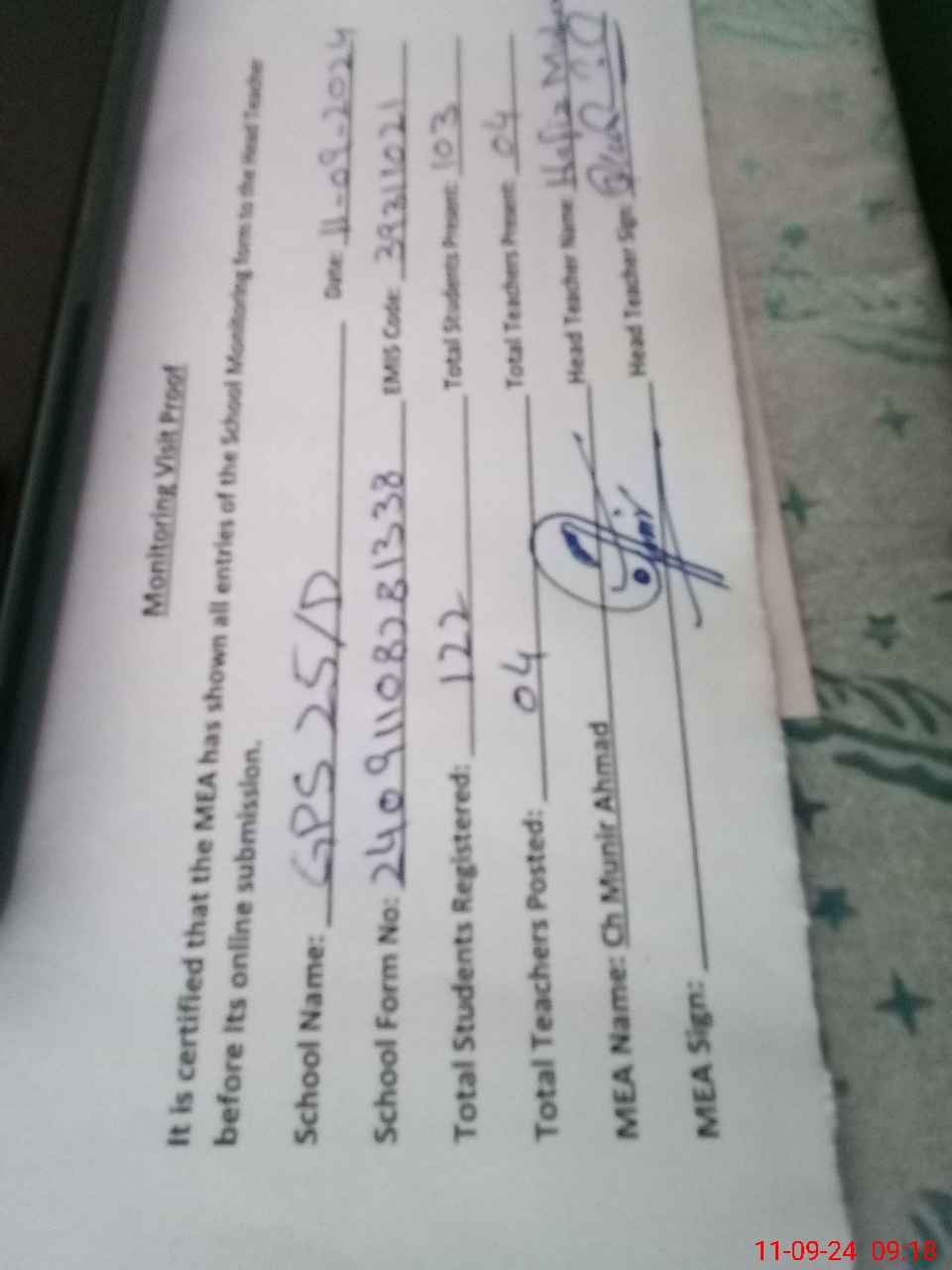 | EMIS Code: 39311021 | Name of School: GPS CHAK NO. 25/D | |||