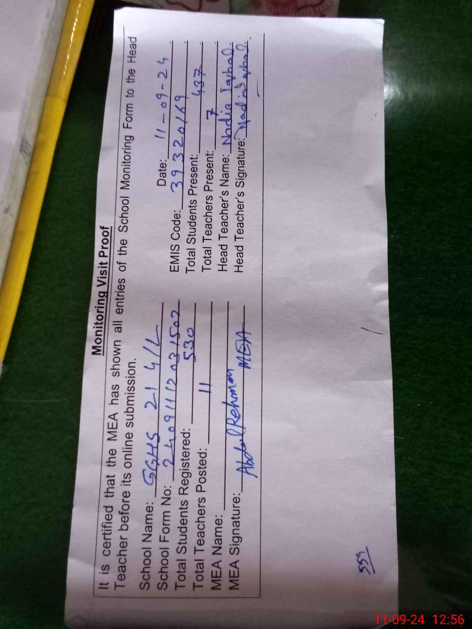 | Attendance Register | Head Teacher | MEA with School | Visit Proof |