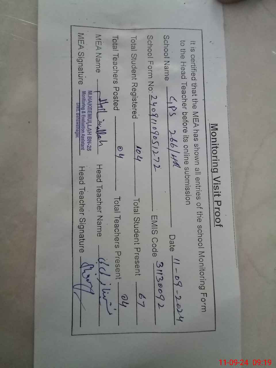 | Attendance Register | Head Teacher | MEA with School | Visit Proof |