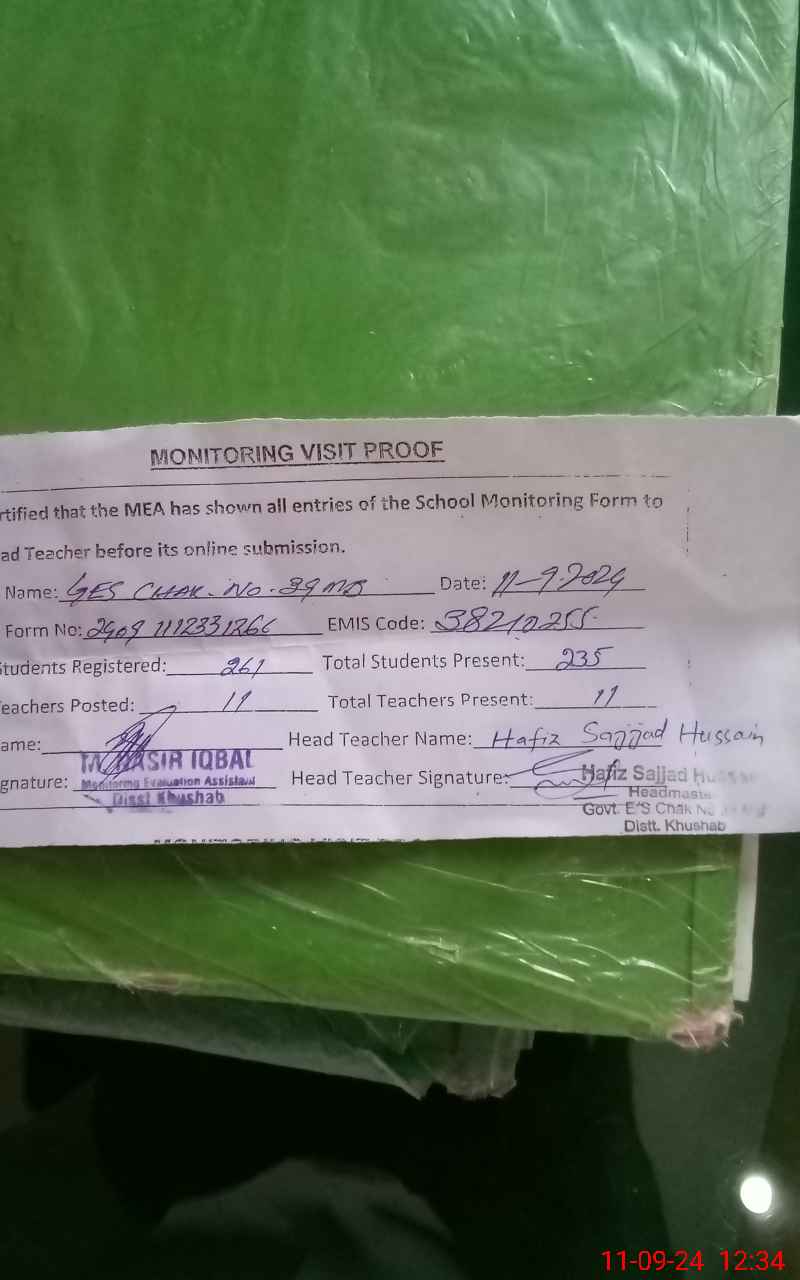 | EMIS Code: 38210255 | Name of School: GES CHAK NO 39 MB | |||