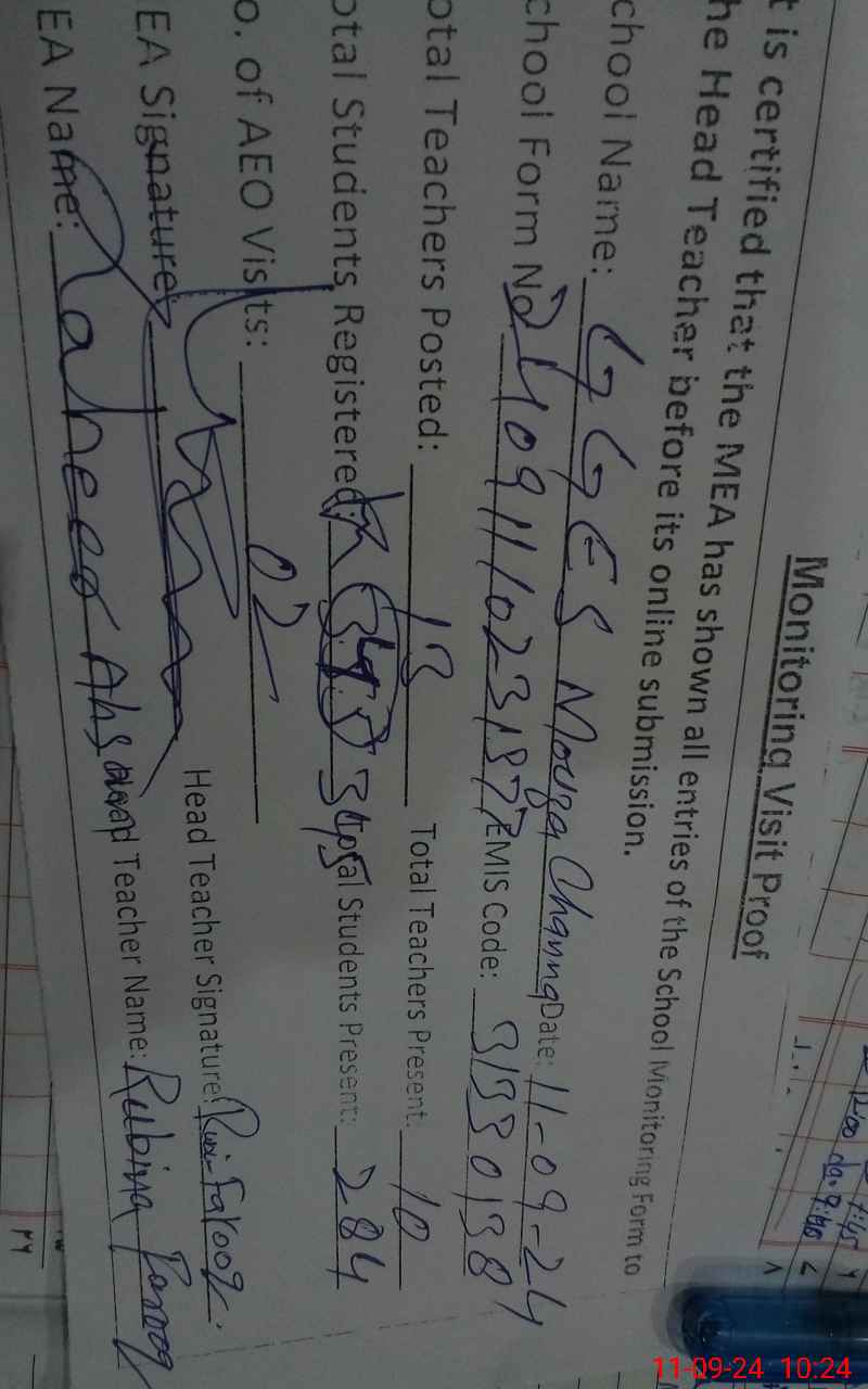 | Monitoring Date: 11-09-2024 | Start Time: 11-09-2024 09:39 AM | End Time: 11-09-2024 10:32 AM | Name of MEA: Za**** Ah**** | |
