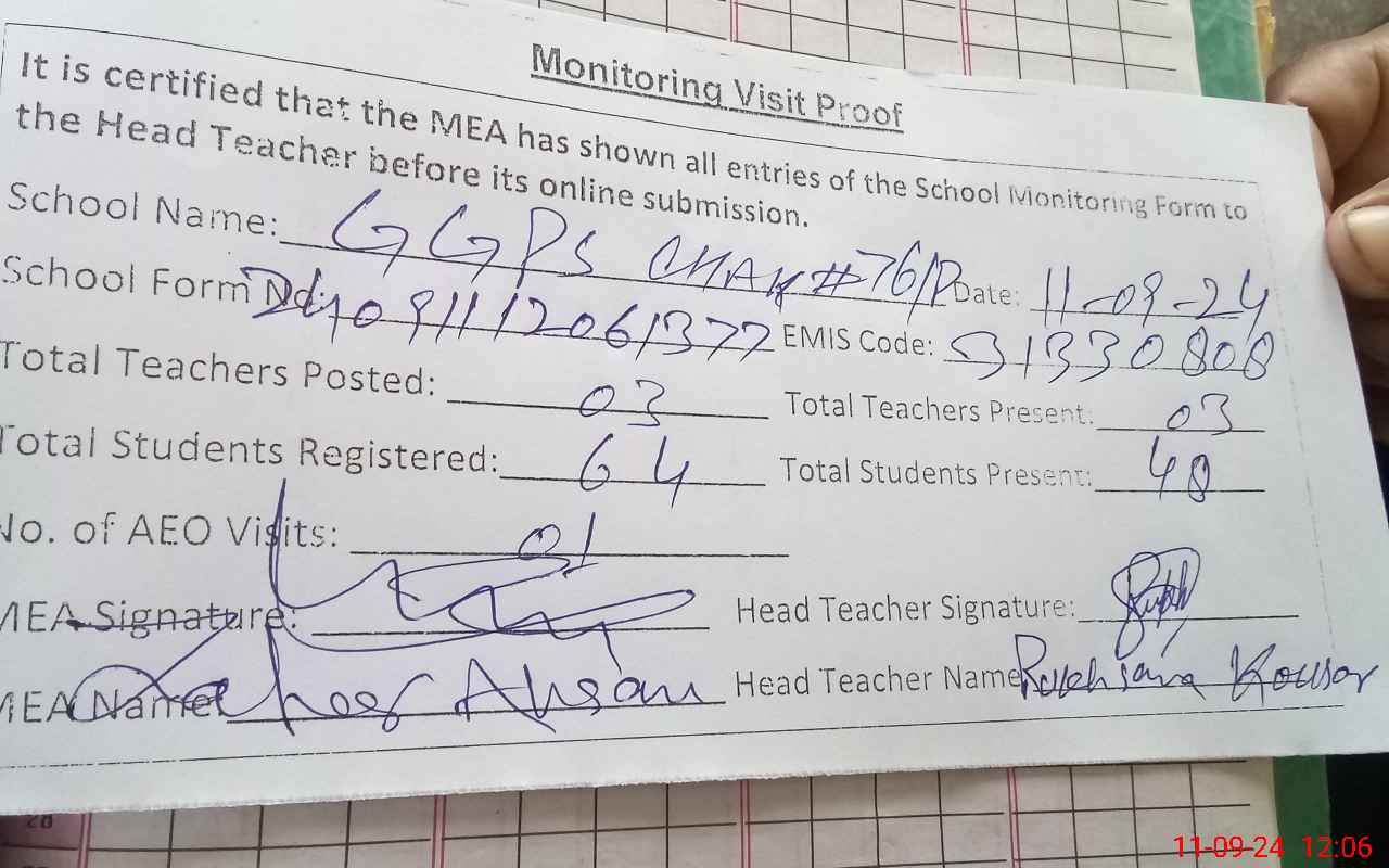 | Monitoring Date: 11-09-2024 | Start Time: 11-09-2024 11:33 AM | End Time: 11-09-2024 12:12 PM | Name of MEA: Za**** Ah**** | |