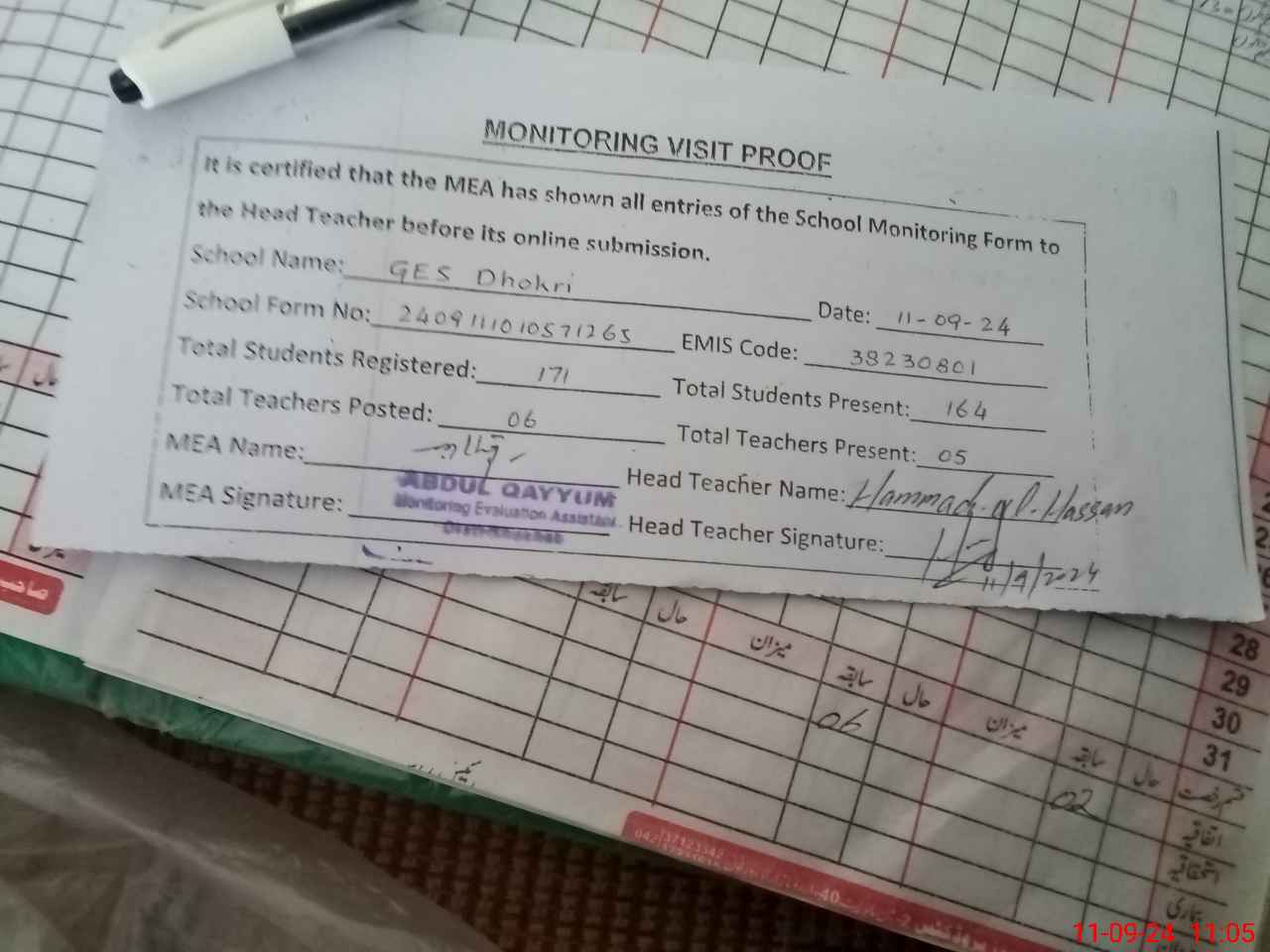 | Attendance Register | Head Teacher | MEA with School | Visit Proof |
