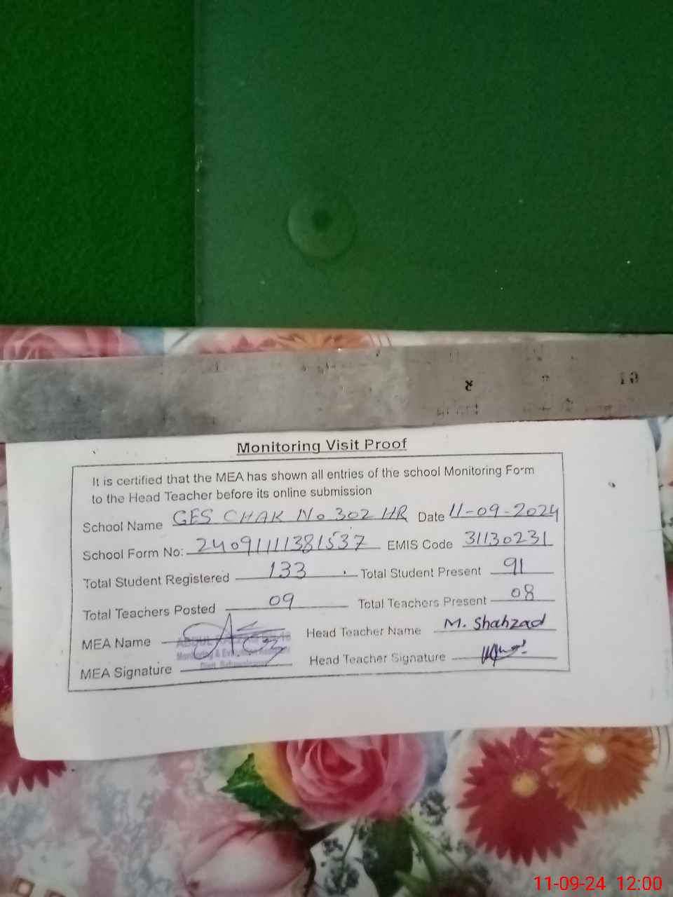 | Attendance Register | Head Teacher | MEA with School | Visit Proof |