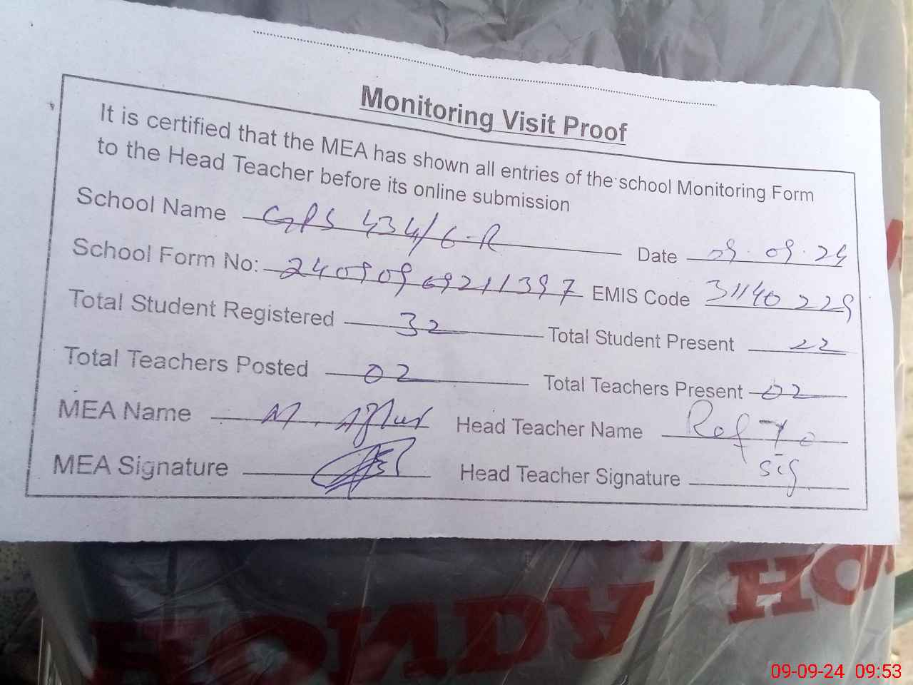 | Attendance Register | Head Teacher | MEA with School | Visit Proof |