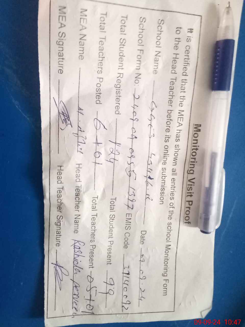| Attendance Register | Head Teacher | MEA with School | Visit Proof |