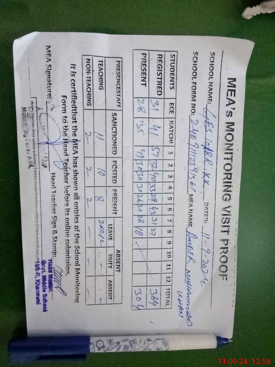 | Attendance Register | Head Teacher | MEA with School | Visit Proof |
