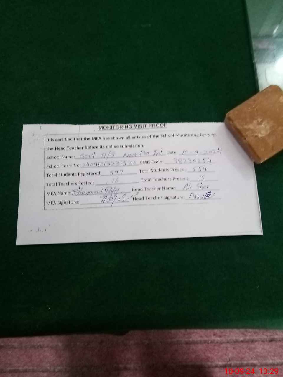 | Certified that this School was Inspected by the Undersigned MEA/DMO Today and the Information Stated Above is as Per Record. | |||||