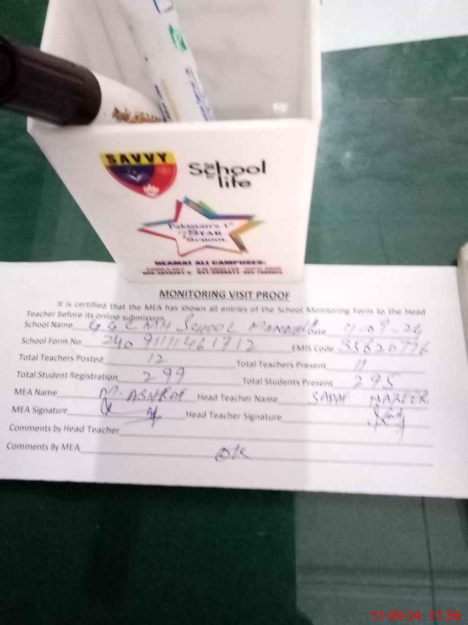 | Attendance Register | Head Teacher | MEA with School | Visit Proof |