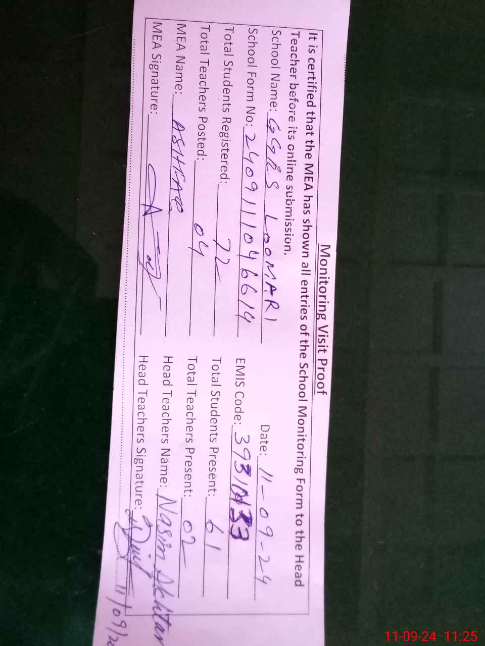 | Certified that this School was Inspected by the Undersigned MEA/DMO Today and the Information Stated Above is as Per Record. | |||||