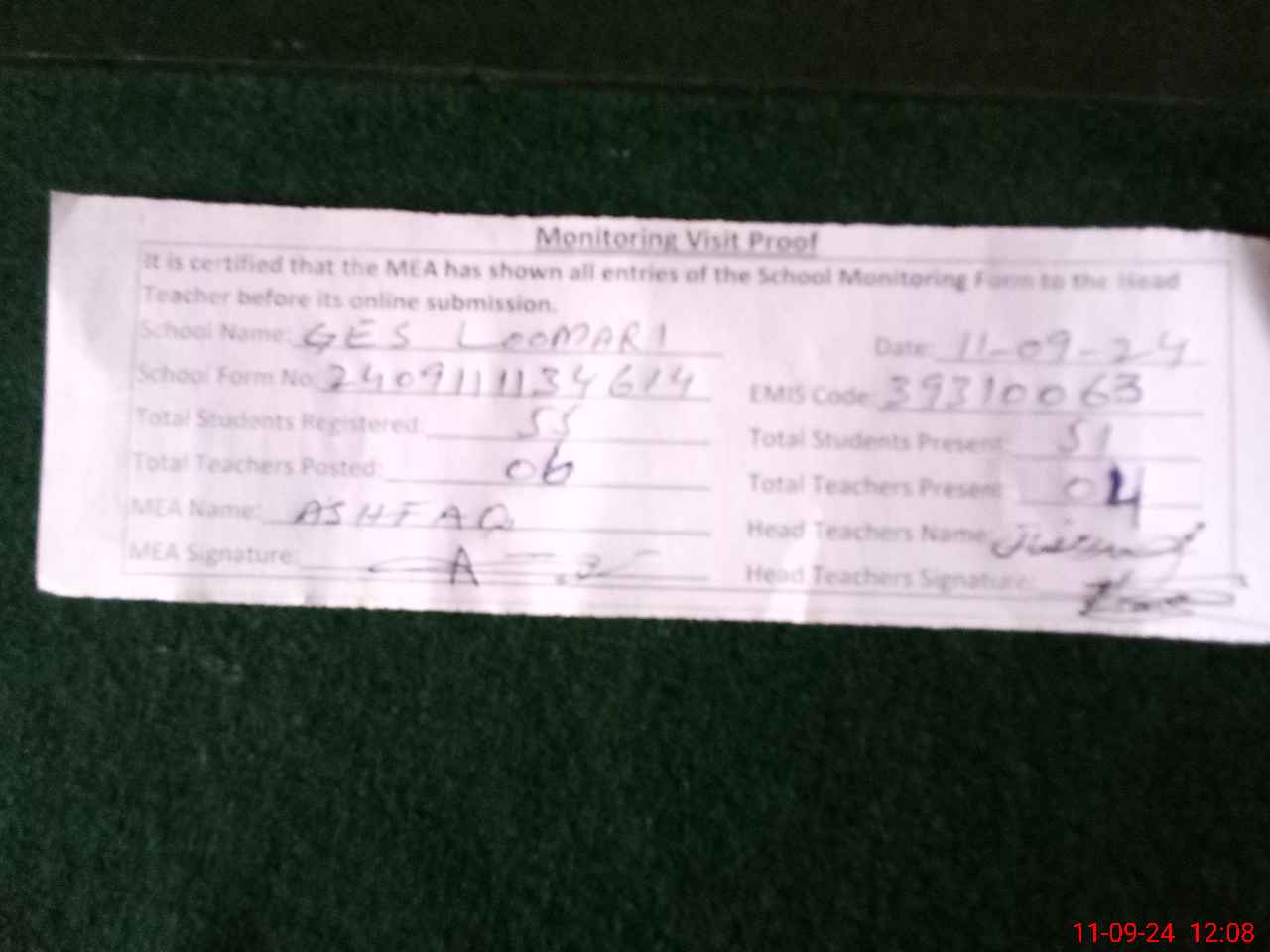 | Attendance Register | Head Teacher | MEA with School | Visit Proof |