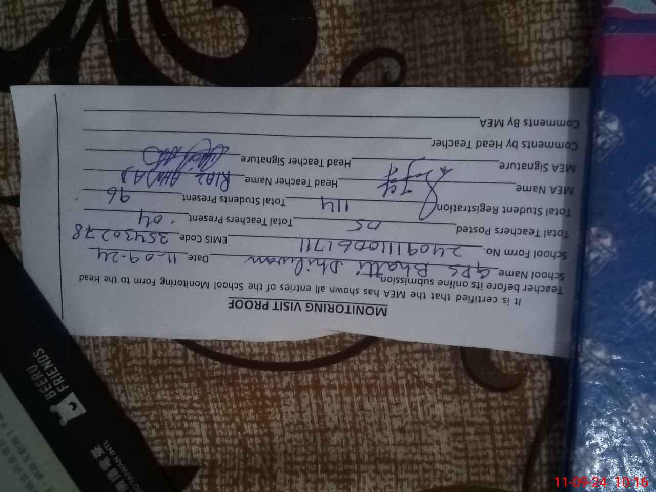 | Name: RI**** AH**** Designation: (School Headmaster's/Headmistress's) PTC/JV Phone/Cell Number: 03**** |