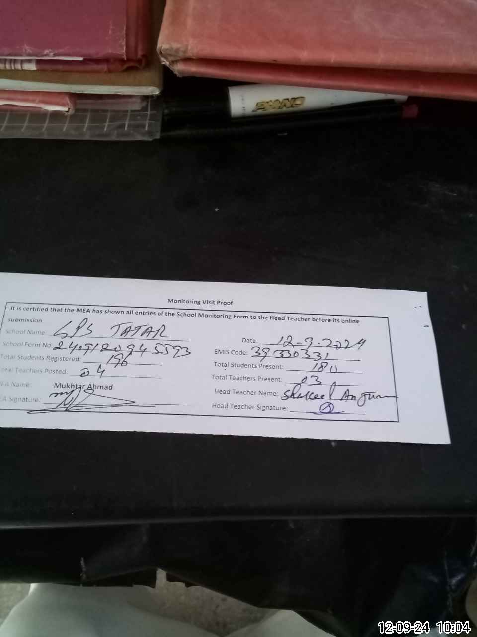 | Attendance Register | Head Teacher | MEA with School | Visit Proof |
